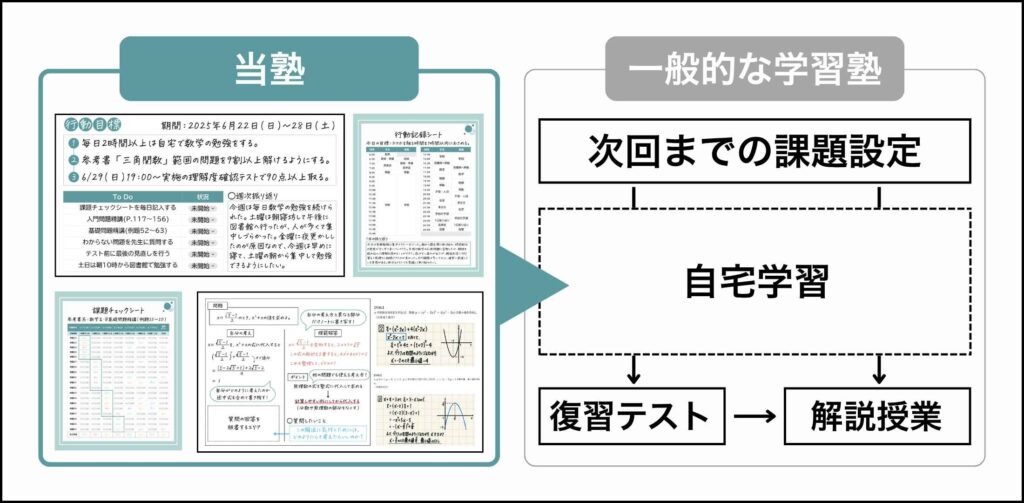当塾の強みは「自宅学習のサポート体制」です。塾がない日の自宅学習の「質」を高める指導を行っていきます。