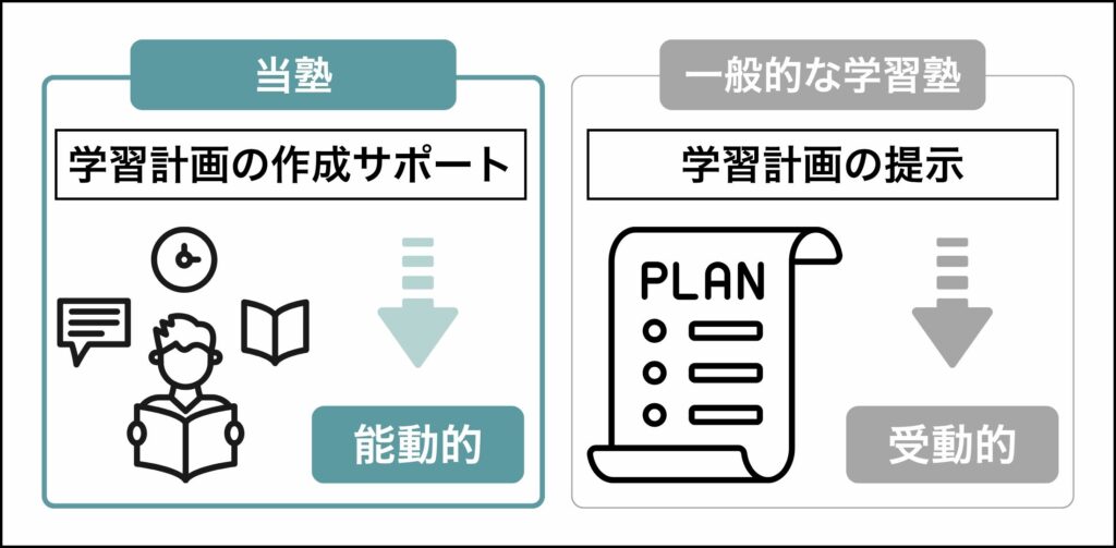 生徒1人ひとりが主体的に学べる力」を育てます。まずは「目標設定の手法」や「学習計画の立て方」から指導します。