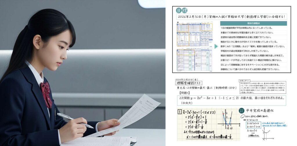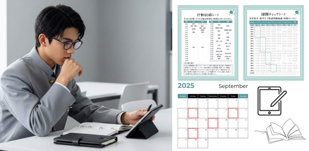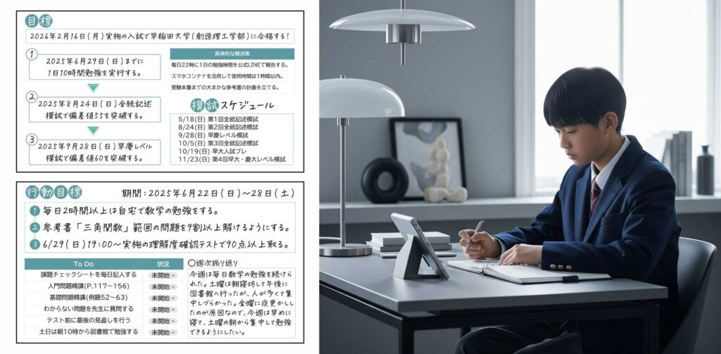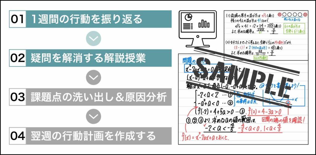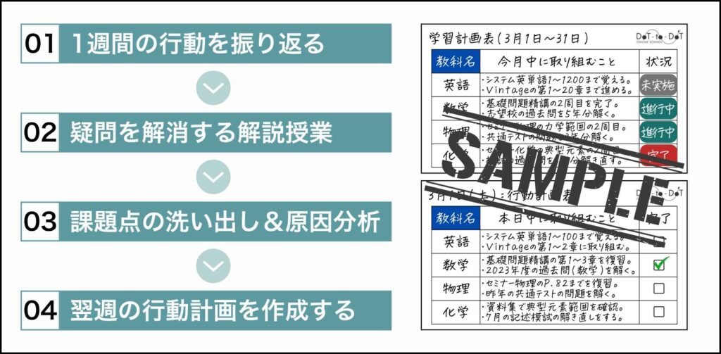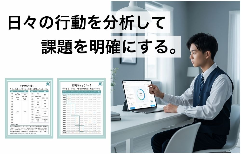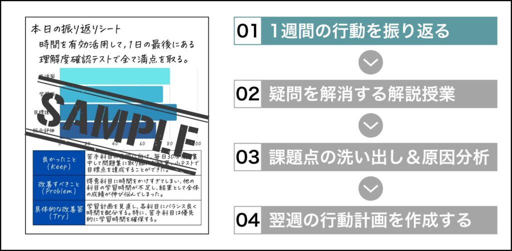 授業を通して出てきた改善策を実行するために,具体的な行動計画を作成していきます。今後のスケジュールも確認しながら現状に即した学習計画の作成をサポートしていきます。